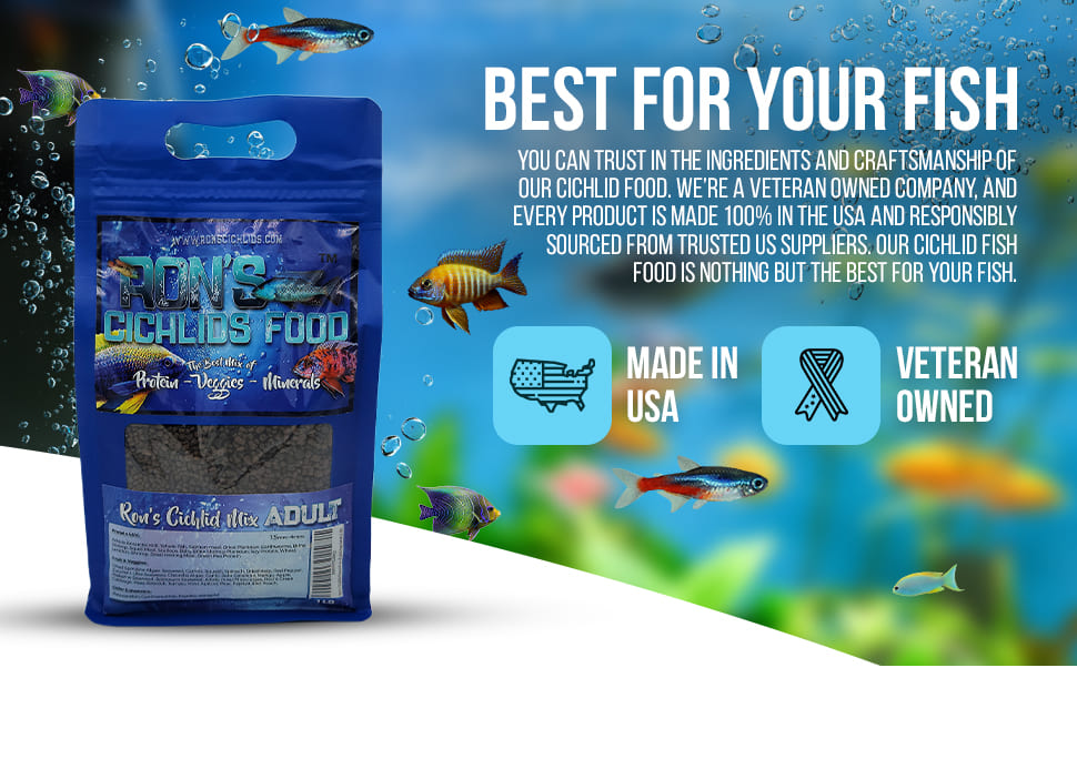 In addition to being avid aquarists and sellers of African Cichlids, we also offer the highest quality African Cichlid food. Ron’s Cichlids food is professionally developed to improve the health and well-being of your Cichlids and other freshwater fish, while naturally enhancing their brilliant colors. Made with quality ingredients, this balanced and nutritious daily diet is completely free of fillers, hormones, and artificial pigments. Easily digestible, slow-sinking pellets promote optimal nutrient absorption.